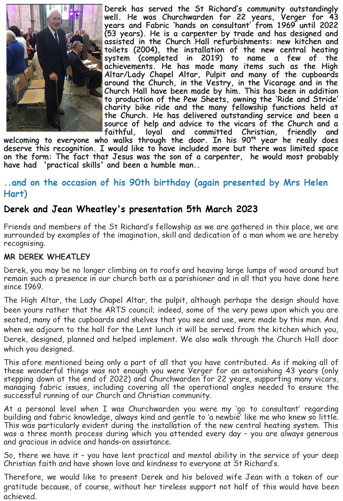 A dedication to the long service and contribution of Mr Derek Wheatley to St Richard's Church